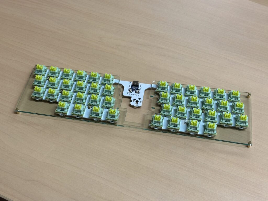 上面用アクリルプレートと基板を重ねて、キースイッチをはめ込み、つづけてキーキャップをはめ込みます。