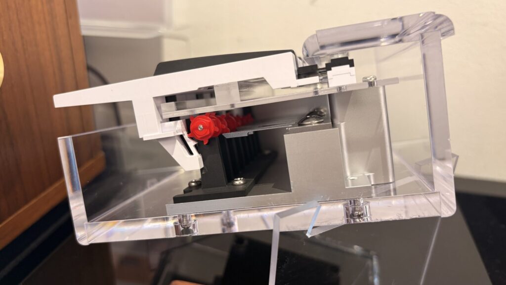 仕組みとしては、CANADEONがiPhoneアプリやMIDIキーボードから信号を受け取ると、CANADEON内部の電磁装置(マイクロソレノイド)が動きます。それにより、クラッチが外れて爪車が回転し、振動板を物理的に弾いて音が出るという流れです。