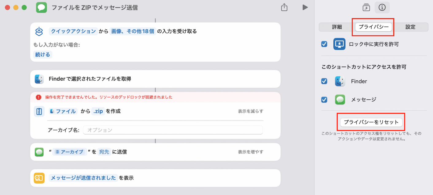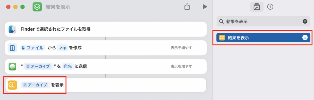 今回の基本的な流れは、①ファインダからファイルを取得、②ファイルをZIP形式で圧縮、③アーカイブを「メッセージ」に送信、という3つのアクションです。