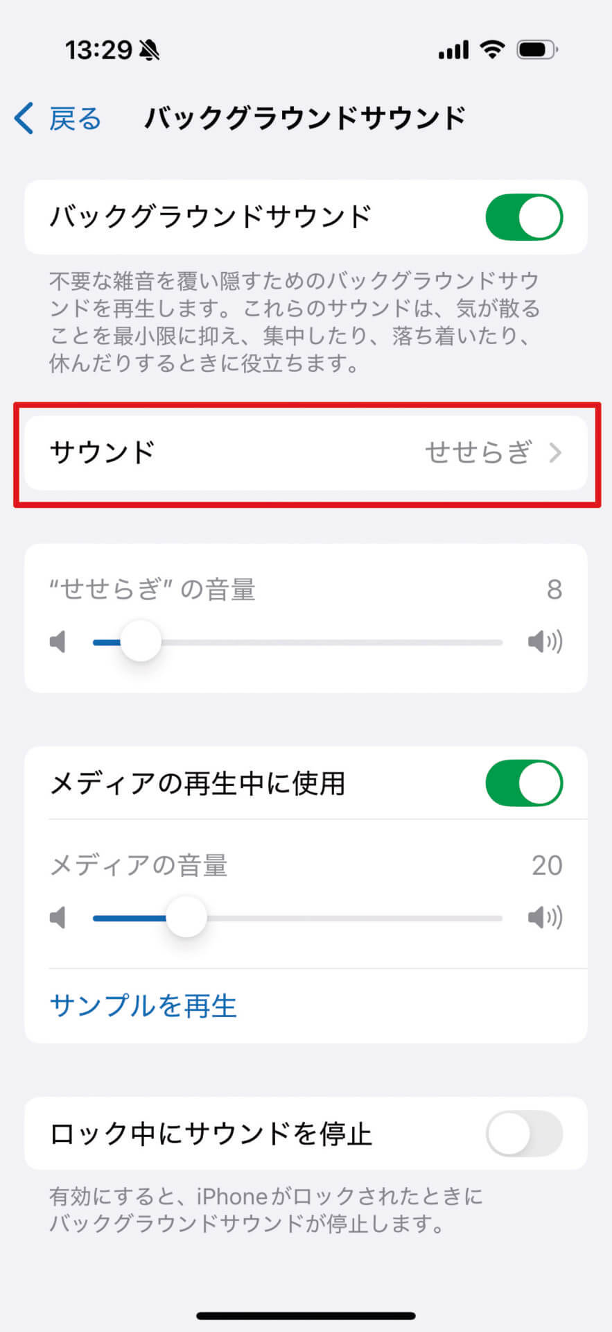 仕事や勉強中に周囲の雑音が気になる、あるいは静かすぎて逆に集中できないときには、「バックグラウンドサウンド」機能を活用してみましょう。ホワイトノイズや雨音、波の音などを流すことで、雑音を和らげ、集中力を高められます。音楽を流せない場所でも、小さな音量でなら気にならずに使えるため、周囲への配慮もしやすいでしょう。
