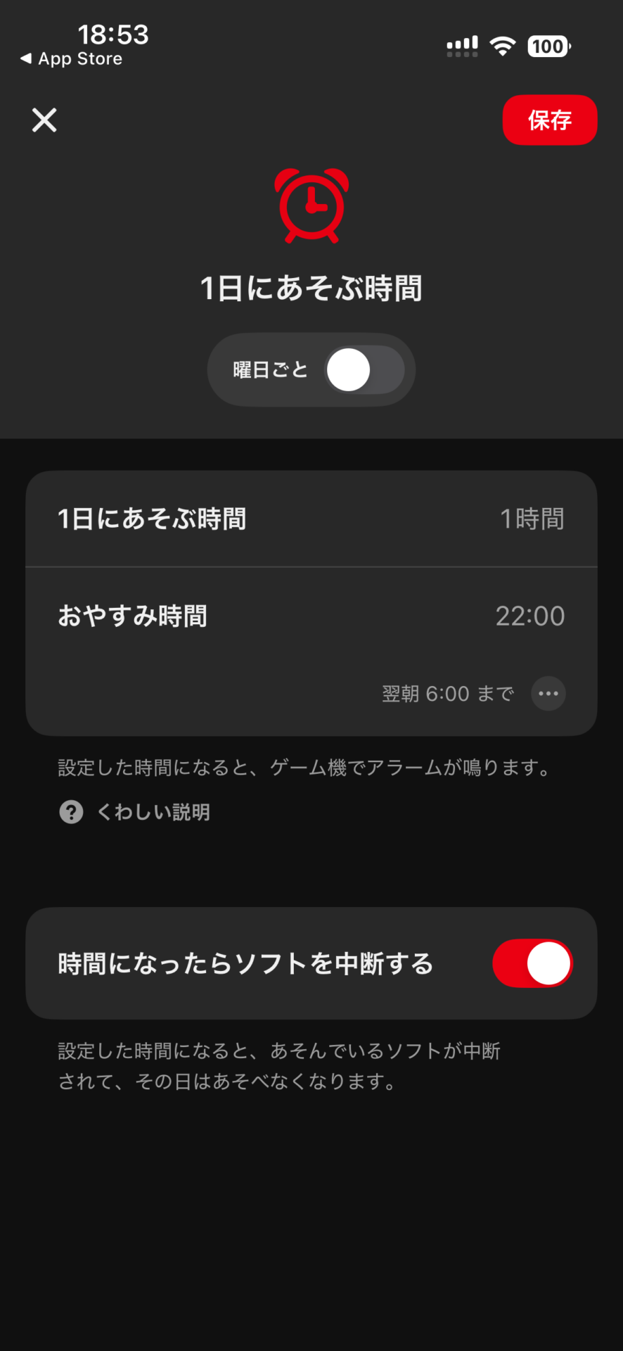 また、「時間になったらソフトを中断する」をオンにしておけば、設定した時間になると強制的にソフトが中断され、その日はもうプレイできなくなります。